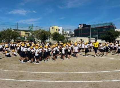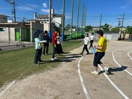 避難できた学級から集合整列し、全員そろっているか点呼をします。
