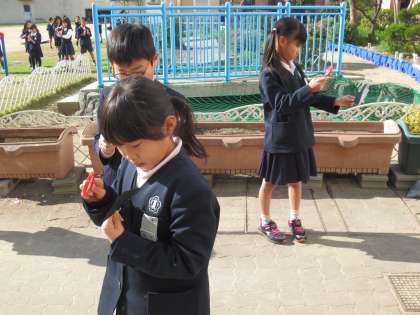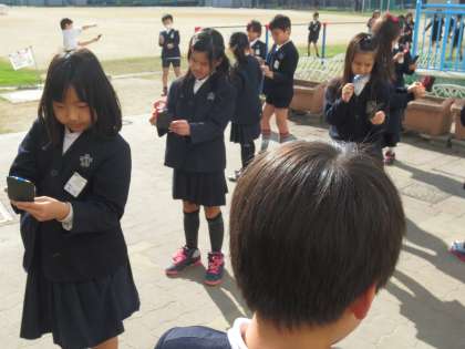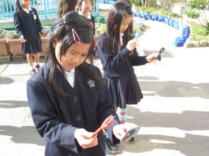 安全に虫めがねを使い、太陽の光を集めています。黒い画用紙の光の点から、もくもくと煙がでていました。
