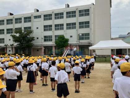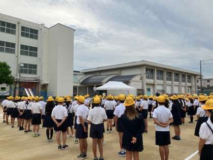 全校児童が、校長先生と元気よく朝のあいさつをして、話を聞きました。