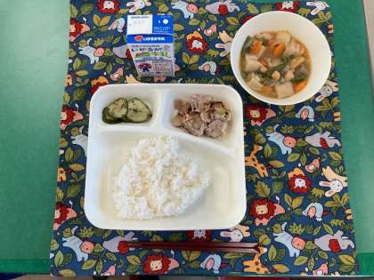 豚肉のねぎしょうゆ焼き、ふきよせ煮、きゅうりの赤じそあえ、ごはん、牛乳