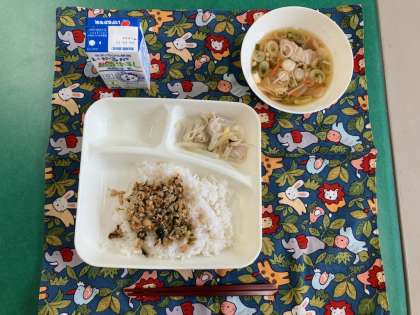 鶏肉のゆず塩焼き、ソーキ汁、ツナ大豆そぼろ、ごはん、牛乳