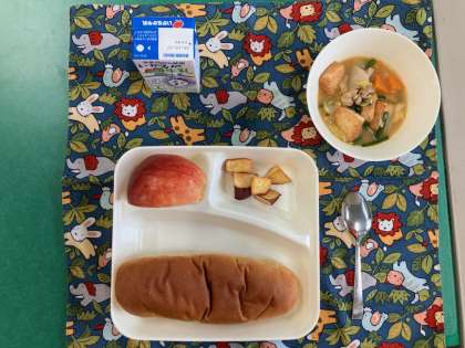 中華煮、大学いも、りんご、パン、牛乳