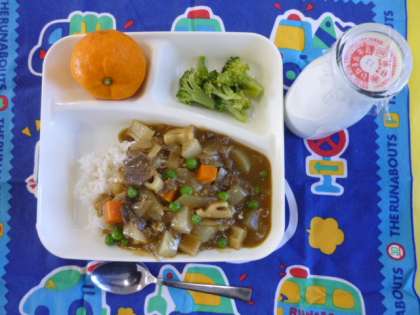 冬野菜のカレーライス、ブロッコリーのサラダ、みかん、牛乳