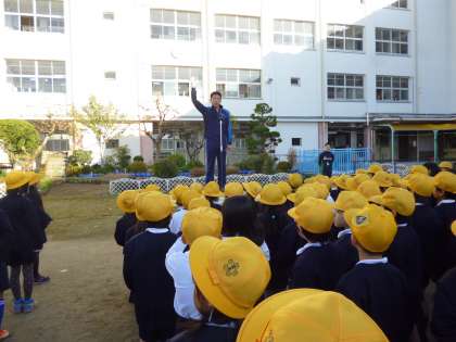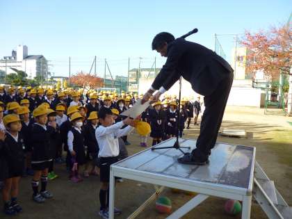 2年生の児童に消防署より表彰がありました。保健委員会の児童が「手洗い・うがい強調週間」の呼びかけと、今日の給食時間のテレビ放送(保健委員会)を伝えました。最後に上野先生より、学校のルールについてと、マンション等の敷地内でのボール遊びについて注意がありました。