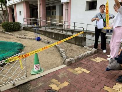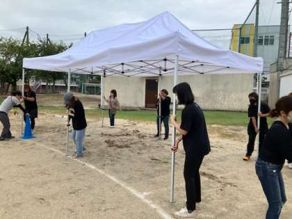 児童のためにテントを立ててくださったり、立ち入り禁止のロープを張ったりしていただいています。