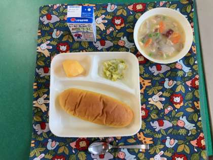 鶏肉、ベーコン、さつまいも、たまねぎ、コーン、にんじん、グリンピースの入ったシチューです。アレルギーの児童も食べられるように対応したシューの素を使用しています。