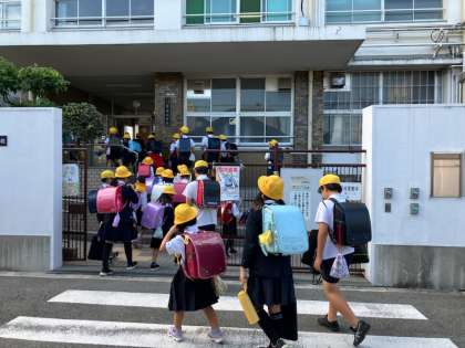 班長を中心に集団登校をしています。朝晩は気温が下がってきたこともあり、上着を着て登校する児童も見られます。