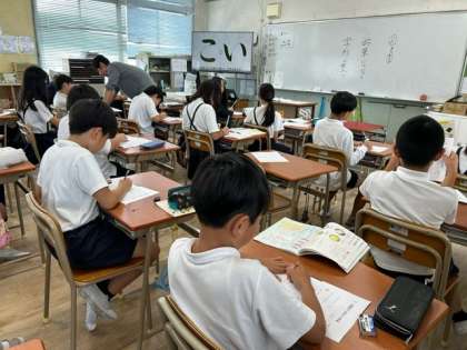 1組の国語科(書写)では、子どもたちが、点画のつながりと字形に注意し、丁寧に文字を書いていました。