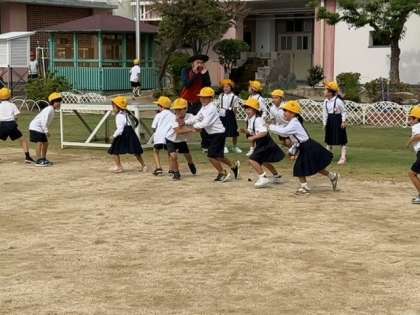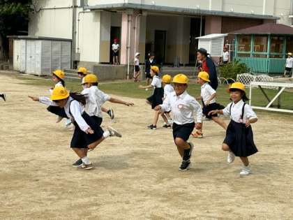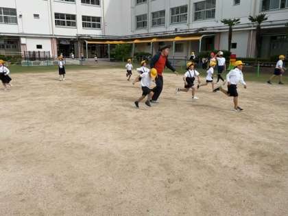 1年生の子どもたちが、先生と一緒に「鬼ごっこ」をしています。