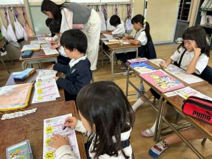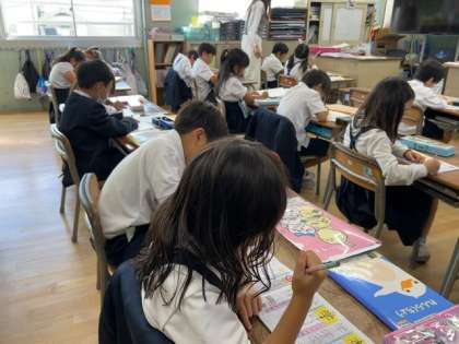 子どもたちが、漢字ドリルで、大好きな学校の「学」「校」や「本」などの漢字を、お手本を見ながら、ていねいに書く練習をしていました。