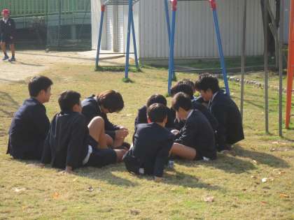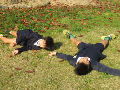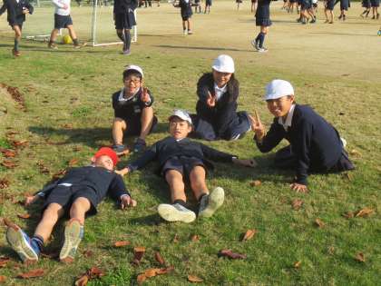 冬とは思えないあたたかな運動場で、寝転がったり話し合ったりしています。休み時間の元気な子どもたちの様子をご覧ください。