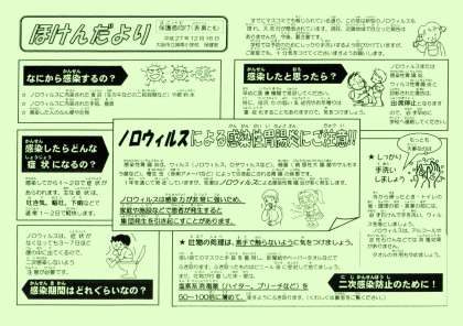すでにマスコミでも報じられている通り、この冬は新型のノロウィルスも現れ、大流行が懸念されています。現在、近隣地域で目立った報告はありませんが、今後、要注意です。