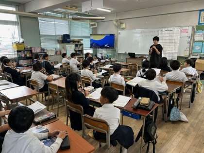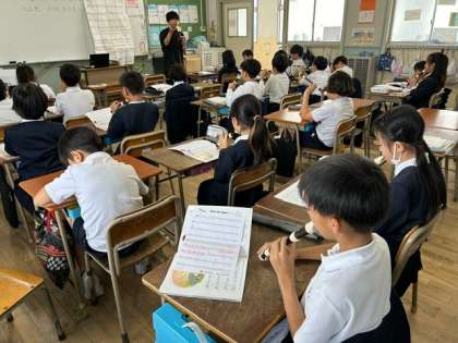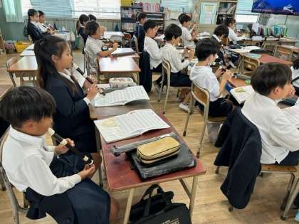 「うさぎ」の曲を鑑賞した後、子どもたちが「Make you happy」の曲を、先生と一緒にリコーダーで吹いていました。