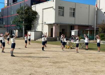 先ずは準備運動、子どもたちが「ラジオ体操」をしています。