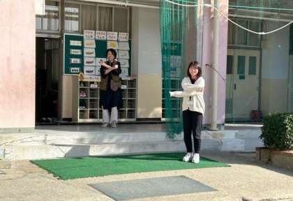 保健室前では、保健の先生と現場実習の大学生も、音楽に合わせて体操をしていました。