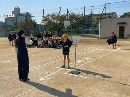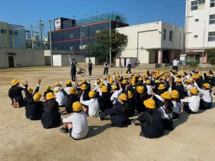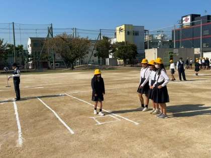 高学年(5・6年生)も、自転車の正しく安全な乗り方について、おまわりさんから話を聞いた後、自転車に乗ったと仮定し実際にコースを回りました。