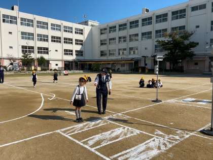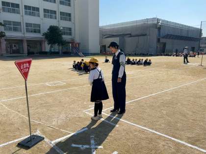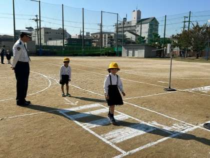 1・2年生の子どもたちが、「止まれ」の標識や信号に注意しながら、一人ずつコースを歩きました。