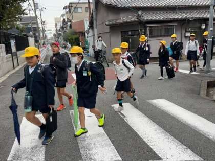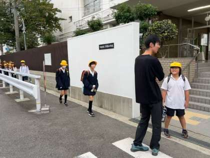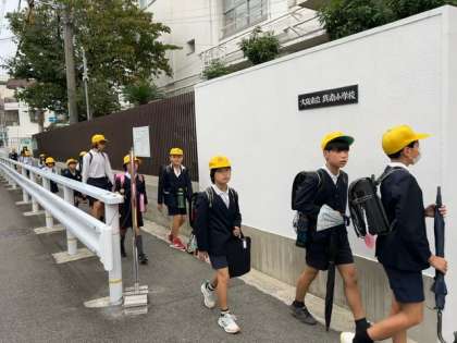 登校してきた子どもたちが、校長先生、看護当番の先生とあいさつを交わして門を入っていきます。