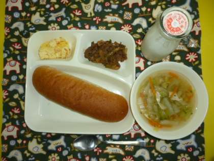 牛肉のケチャップソテー、はくさいのスープ、焼きプリン、ライ麦パン、牛乳