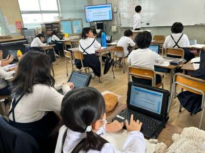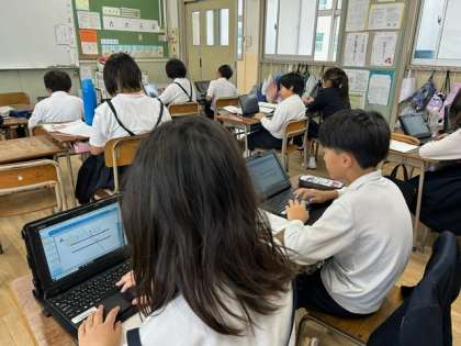 タブレット端末を使って平行な直線の特徴について考え、ペアで意見を交流しました。