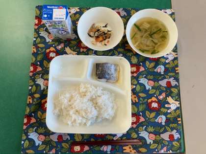 さごしのごまじょうゆかけ、すまし汁、大豆の煮もの、ごはん、牛乳
