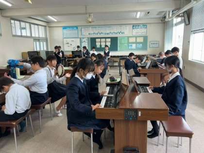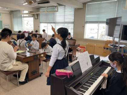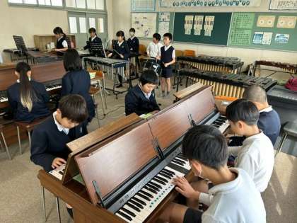東館4階の音楽室に行くと、2組の子どもたちが、真剣かつ楽しそうに「キリマンジャロ」を演奏していました。