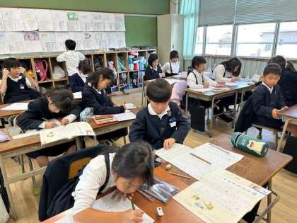 1組の国語科(書写)では、子どもたちが、お手本を見てしっかりした文字を書いていました。
