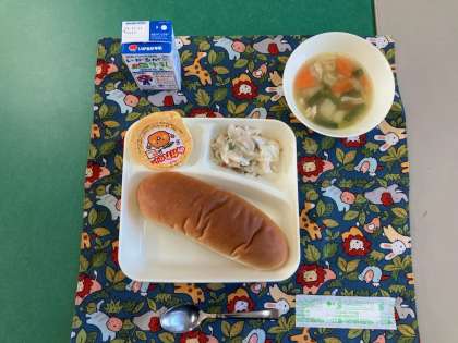 きのこのドリア、鶏肉と野菜のスープ、みかんゼリー、パン、牛乳