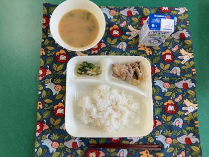 豚肉のしょうが焼き、さつまいものみそ汁、きくなとはくさいのごまあえ、ごはん、牛乳