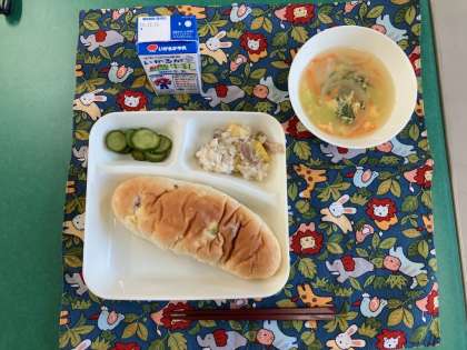 中華おこわ、卵スープ、きゅうりのピリ辛あえ、パン、牛乳