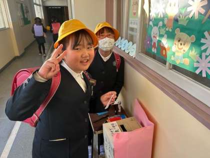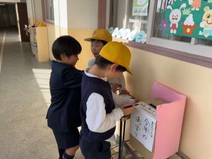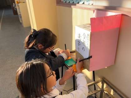 校長室前で、子どもたちが「自分にとっての今年の漢字」を書いていました。