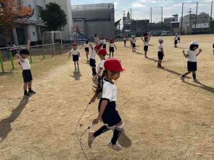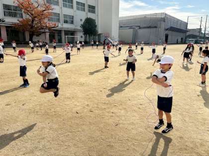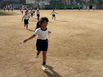 体育科の時間に、子どもたちが、運動場で元気に「なわとび」を使った運動をしていました。