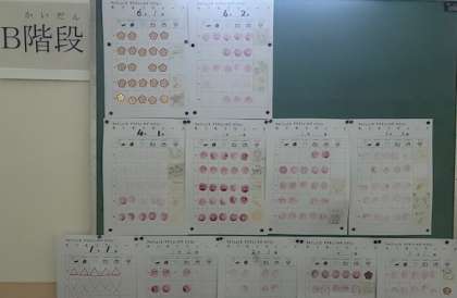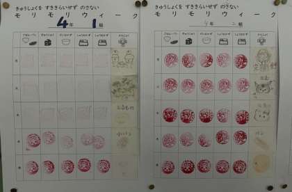 ごはん(パン)や主菜・副菜ごとに食缶が空になっているか、給食委員が確認してスタンプを押します。すべて完食できていたらシールを貼ります。