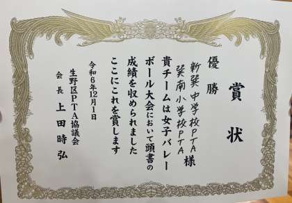 1日の生野区PTAバレーボール大会で、巽南小学校と新巽中学校の合同チームが見事優勝しました。