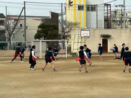 1組の子どもたちが、運動場で「しっぽとり」をして盛り上がっていました。