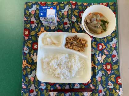 鶏肉と野菜の煮もの、じゃこ豆、かぶのゆず風味、ごはん、牛乳