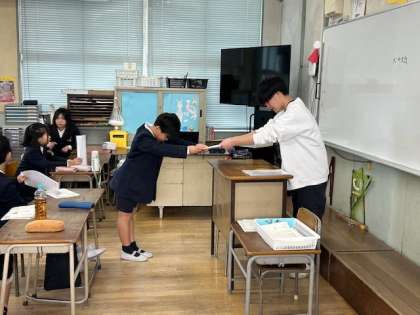先生から通知表を受け取っています。