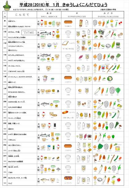 1月給食献立表・はぐくみ通信1月号を今日配付しました。ホームページの右記の配布文書「給食関係」にも載せています。