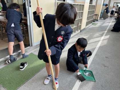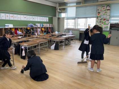 子どもたちが、班ごとに決められた場所を箒(ほうき)で掃いています。寒いですが、雑巾がけもしました。