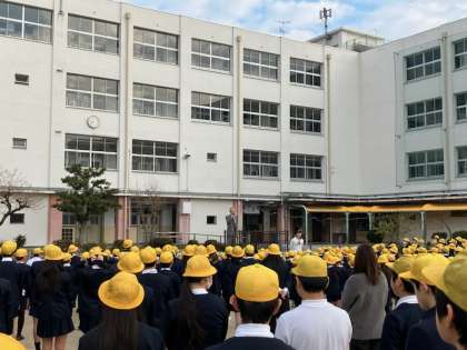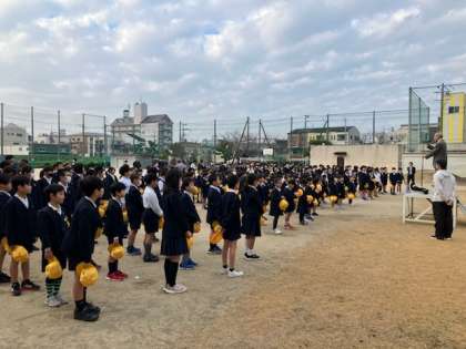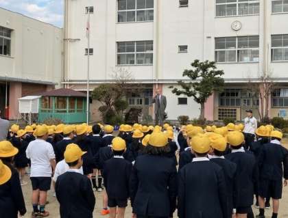 全校児童が、帽子をとって「おはようございます」と大きな声で、校長先生とあいさつをしました。