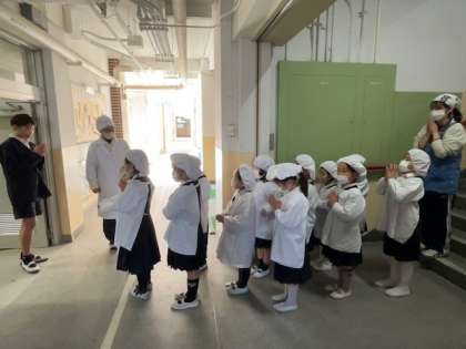 当番の子どもたちが、給食室へ食器や食缶・牛乳を受け取りに来ました。