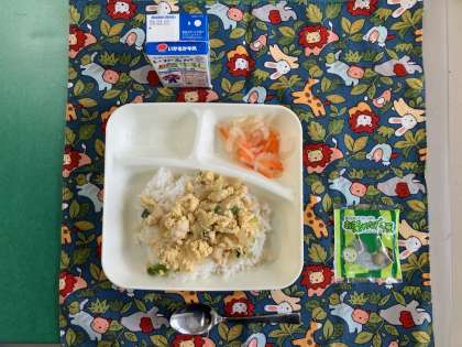 親子丼、紅白なます、まっ茶大豆、牛乳