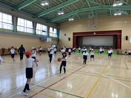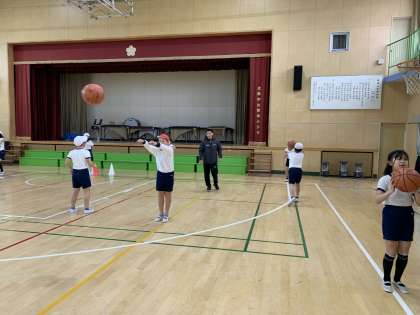 バスケットボールを使って、パスやドリブルの基礎を教えてもらいました。
