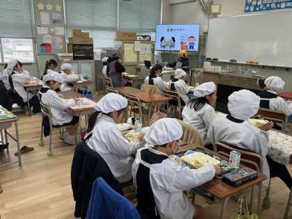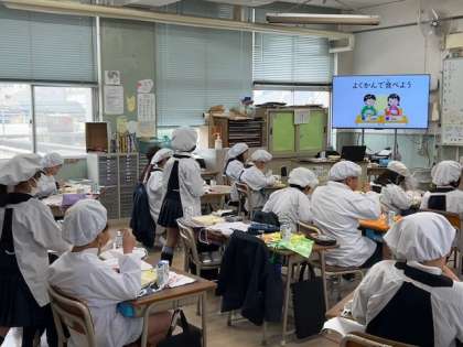 2年生の教室でも、子どもたちが給食を食べながらテレビ画面を見ていました。