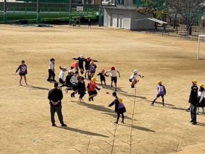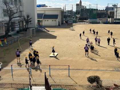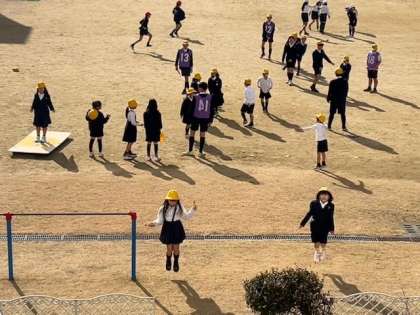 休み時間の運動場を見ると、高学年の子どもたちと低学年の子どもたちが一緒に「大なわ」をして遊んでいました。
