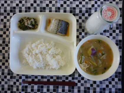 さごしのしょうゆだれかけ、みそ汁、みずなの煮びたし、ごはん、牛乳