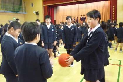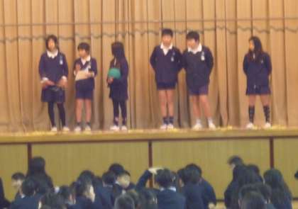 今日の全校集会は、ばくだんゲームでした。輪になってボールを回していって、爆発した時にボールを持っていたらアウトです。アウトになったら、自分の名前と好きなスポーツを言います。集会委員の爆発の合図があるたびに、大きな歓声が上がっていました。
