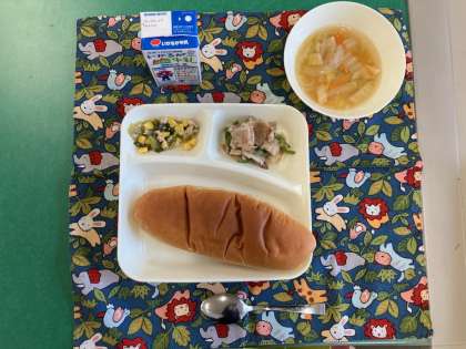 豚肉のオイスターソース焼き、中華スープ、ツナとチンゲンサイのいためもの、パン、バター、牛乳