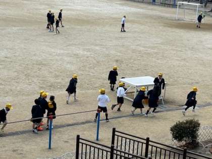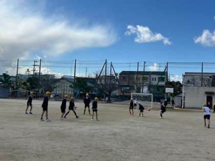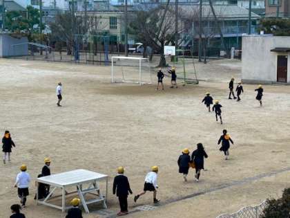 寒い中、子どもたちが、昼休みの運動場で、鬼ごっこやボール遊びをしていました。