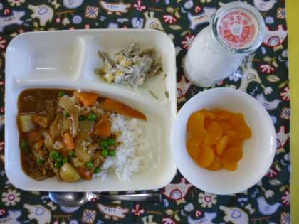 ポークカレーライス、ごぼうサラダ、みかん(缶)、牛乳